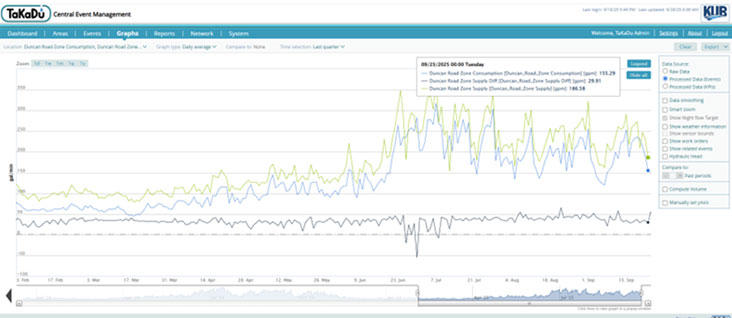 From March 2025 onward, supply in the Duncan Road Zone gradually increased, with a sharper rise observed in late June. When comparing supply with consumption, KUB noted a matching trend, which kept the “Diff” graph (representing water loss) stable—pointing only to a minor, low-priority leak. KUB validated this with additional analysis using the Infrastructure Leakage Index (ILI) and Night Flow.