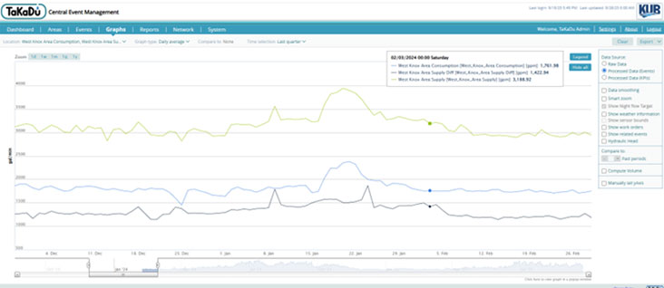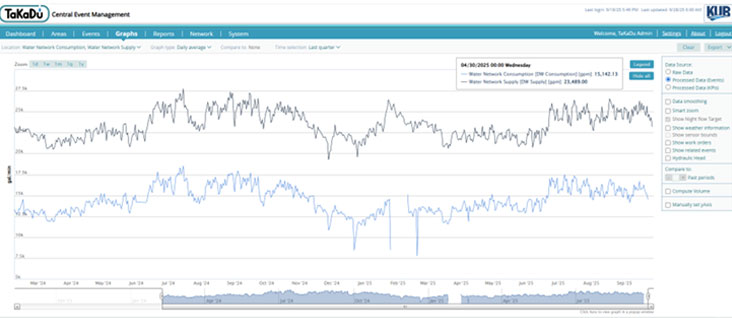 KUB uses TaKaDu to create a bird’s-eye view of the network by aggregating supply and consumption across all the district metered areas (DMAs). Automatic and manual analysis confirmed both curves tracked consistently, with no significant gaps requiring further investigation.